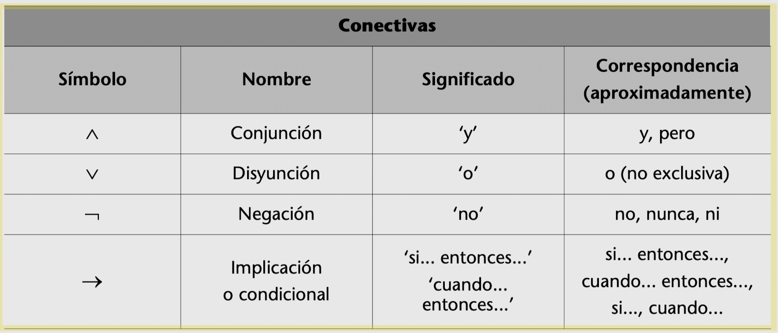 - La conectiva ←>, denominada bicondicional y que se lee ‘si y sólo si’. Es el equivalente a una conjunción de dos implicaciones o condicionales