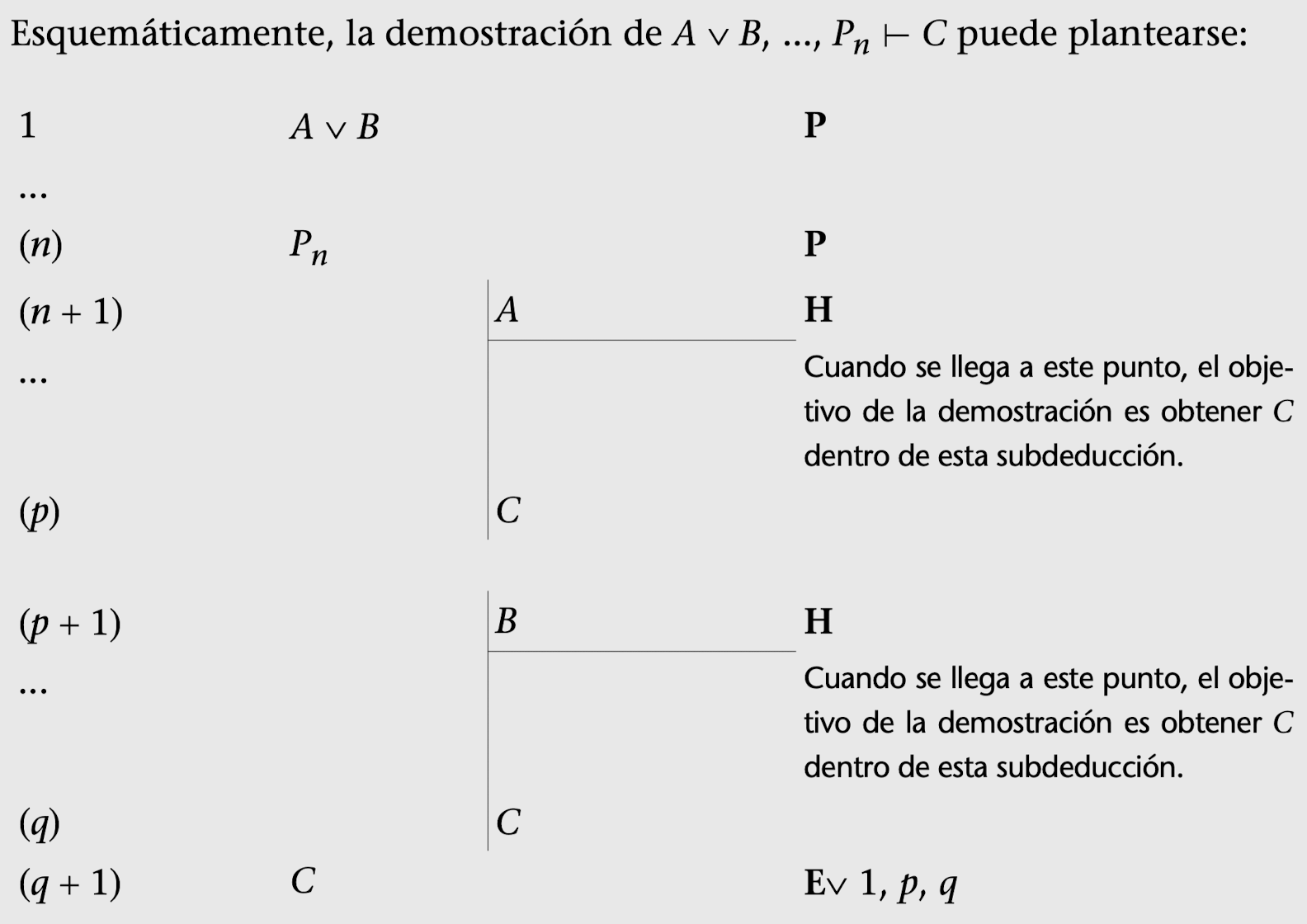 De hecho, no es necesario que cada subdeducción acabe con el enunciado C (la conclusión). También puede pasar que las dos acaben con cualquier otro enunciado que permita obtener C. Lo que sí que debe pasar es que las dos subdeducciones finalicen con el mismo enunciado porque, de otro modo, la Regla de eliminación de la disyunción o prueba por casos no sería aplicable.